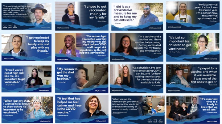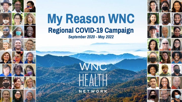 So, I researched who was in communication roles at hospitals and health departments and brought them together. Because we had been meeting consistently, we had built strong relationships. This was essential when the COVID-19 pandemic appeared. We were able to pivot our work into a COVID-19 communications response for our region, which included a collaborative regional COVID-19 campaign called “My Reason WNC.”