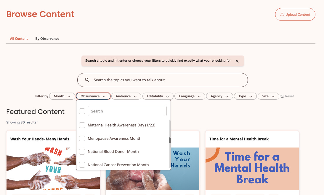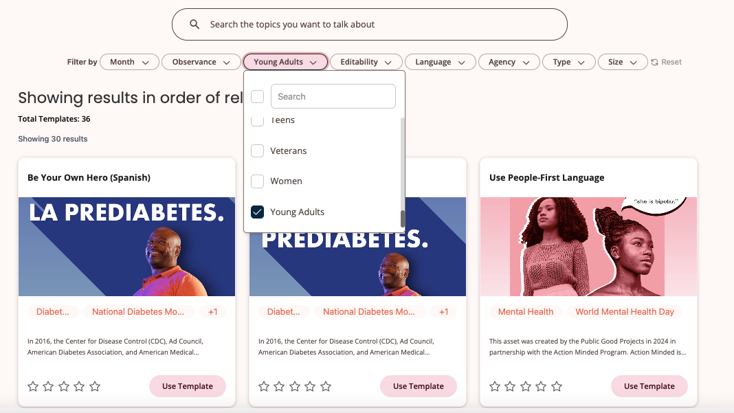 We want people sharing health messaging in their communities to feel supported. There are currently 70 content creators for the platform, including associations like the American Diabetes Association and state health agencies like the North Carolina Department of Health and Human Services (DHHS). For example, we uploaded over 100 editable measles assets in English and Spanish from the North Carolina DHHS. They allowed us to make those assets editable so health communicators outside North Carolina can add their own logo and use them locally.